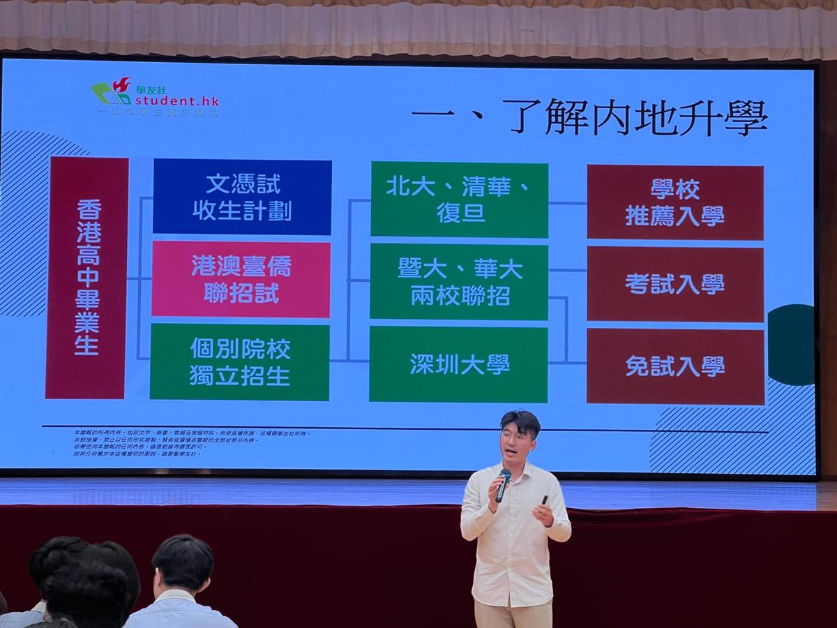 On 2 September, 2025, the Career and Life Planning Committee organized the seminar on studying in Mainland China and abroad for S6 students. On the day, the social workers from the Hok Yau Club provided detailed explanations about the procedures and considerations for studying in Mainland China and overseas. Students attentively participated in the seminar to better prepare for their future studies.
